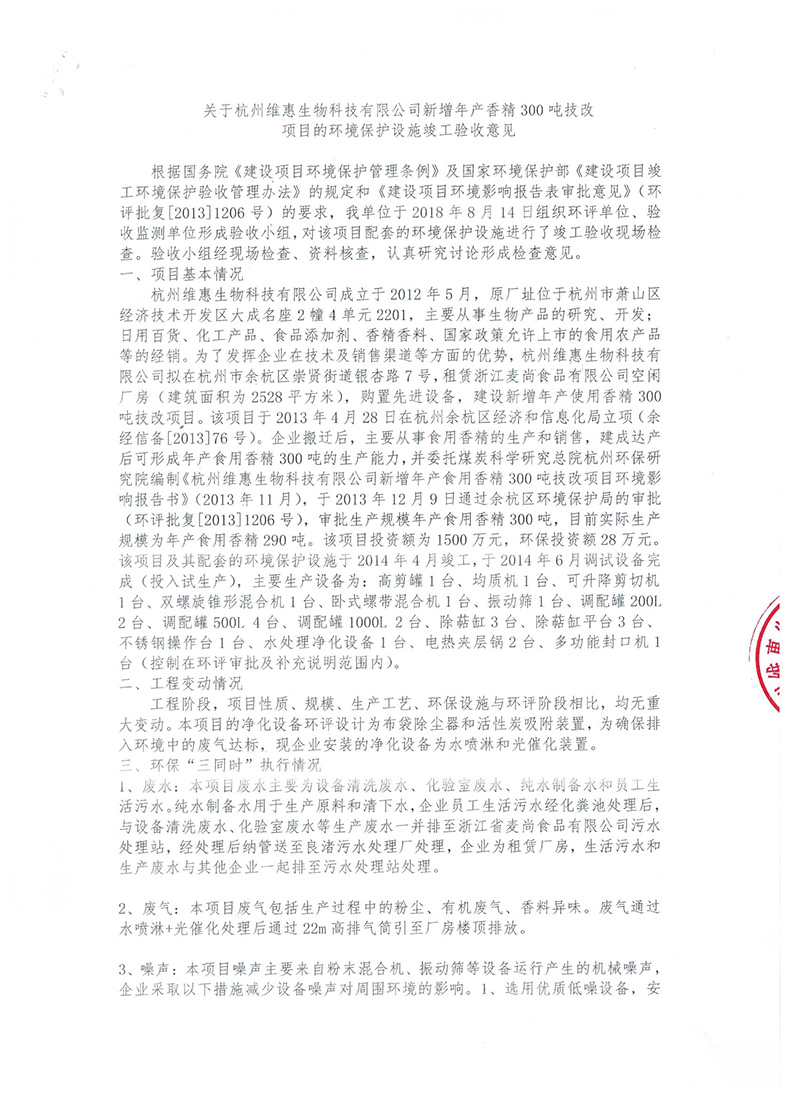 關于杭州維惠生物科技有限公司新增年產香精300噸技改項目的環境保護設施竣工驗收意見